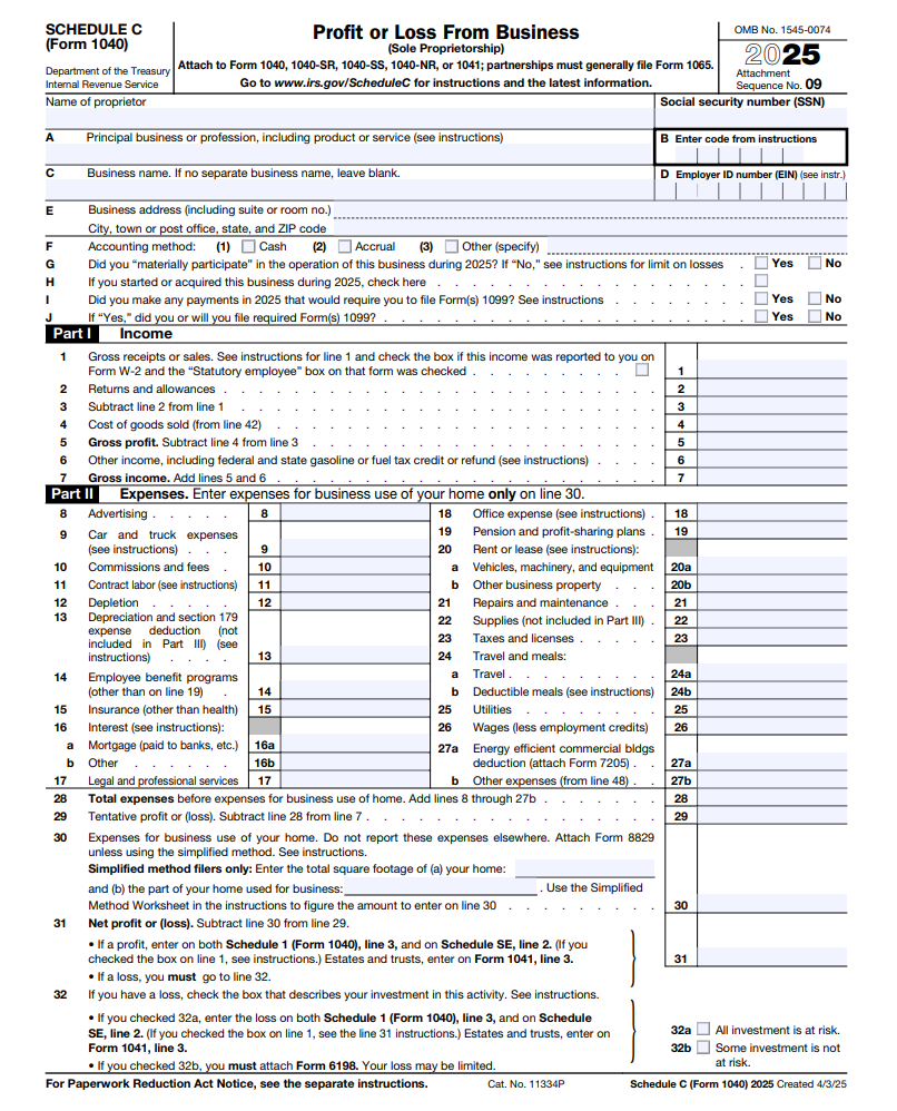 Schedule C is used to report your business income and expenses as a self-employed individual. This is where you list your total earnings from Amazon Flex and subtract any eligible deductions. The result is your net profit or loss for the year, which helps determine how much tax you owe.