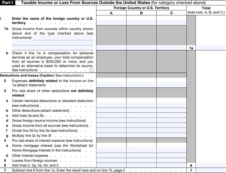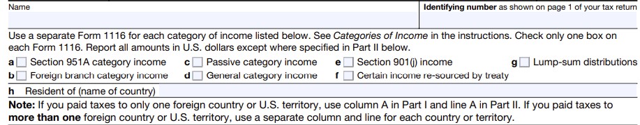 • In Part I, you report your foreign income and identify the category it falls under, such as passive income (dividends, interest), general income (wages, business income), or other specific categories. You must complete a separate Form 1116 for each category of income.