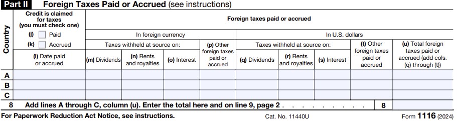 Form 1116 has three main parts, each capturing different information about your foreign income and the taxes you paid.