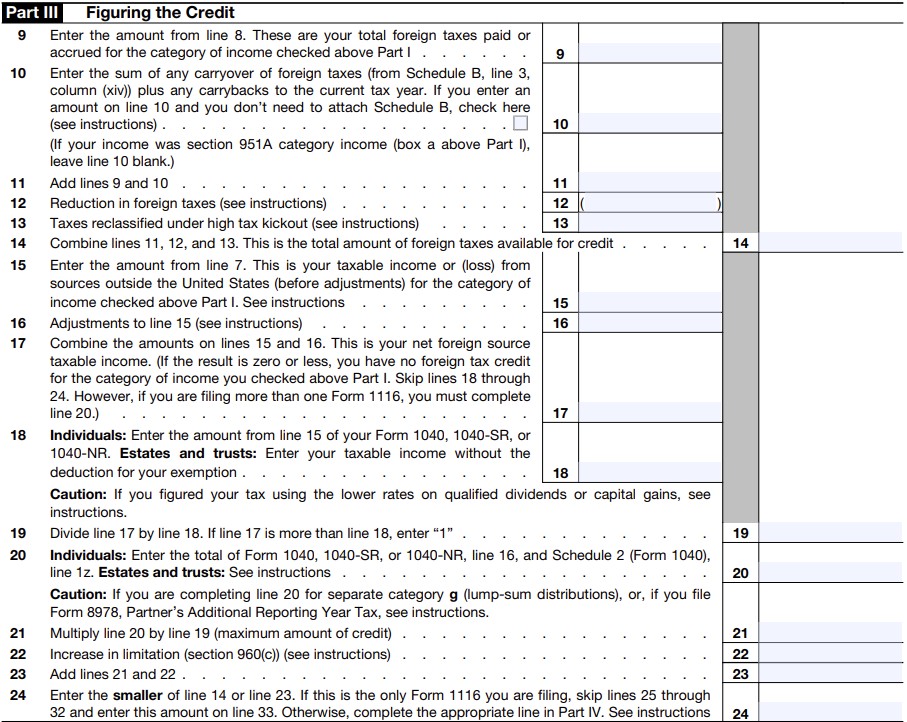 • Part III determines the actual credit you can claim by applying the IRS limitation formula, which verifies that the credit doesn’t exceed your U.S. tax on that same income.