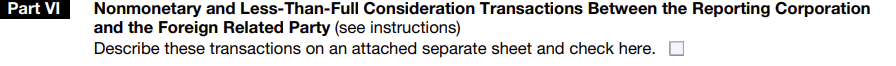 Part VI asks a series of yes-or-no questions about the reporting corporation’s transactions, ownership, and compliance with IRS requirements. These questions cover whether –