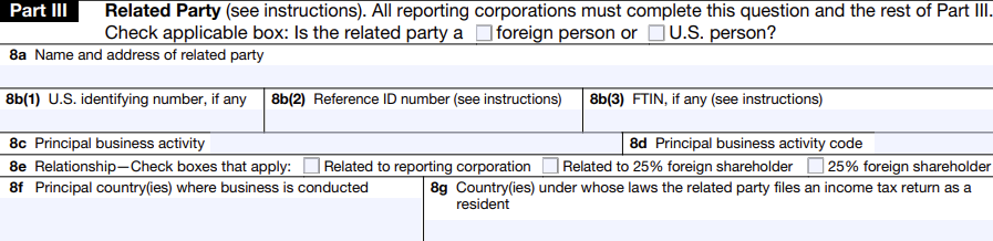 - If the transactions were with a separate related entity, such as a foreign affiliate that shares common ownership with the reporting corporation, you’d complete Part III with that entity’s information instead.
